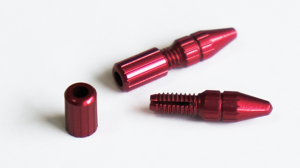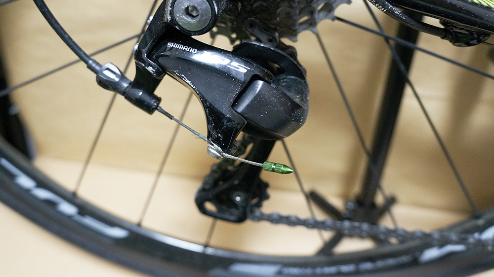 ・シフト用はキャップの横にラインがあります。滑りのよいコーティングワイヤーの場合、きつく締めても滑って容易に外れることがあります。その場合、インナーワイヤーを紙やすりで削ってコーティングを剥がすなどすると、しっかりと固定できる場合があります。間違ってもニッパーで潰そうとしないでください。それをすると確実に壊れます。
