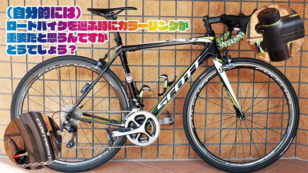 今乗っているSCOTTはカラーリングで一目惚れ。モノトーンがベースのフレームにライムグリーン(黄緑)の配色が鮮やかで気に入って即決しました。