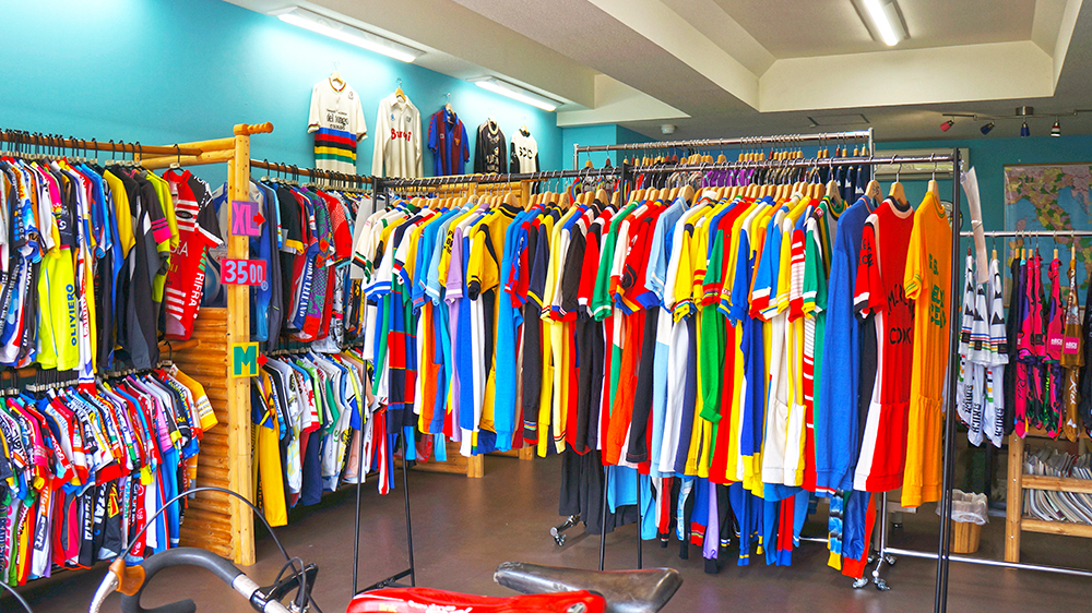 店内には店主さん自らイタリアで買い付けたカラフルなジャージがたくさん並んでいま