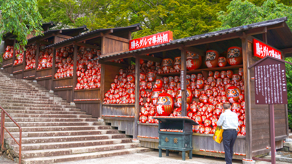 階段を登りきった所に『一願不動堂』があり、その左手には『勝ちダルマ奉納棚』があります。