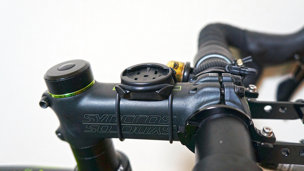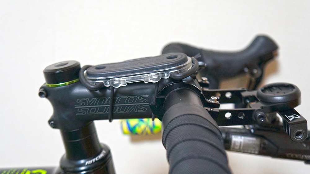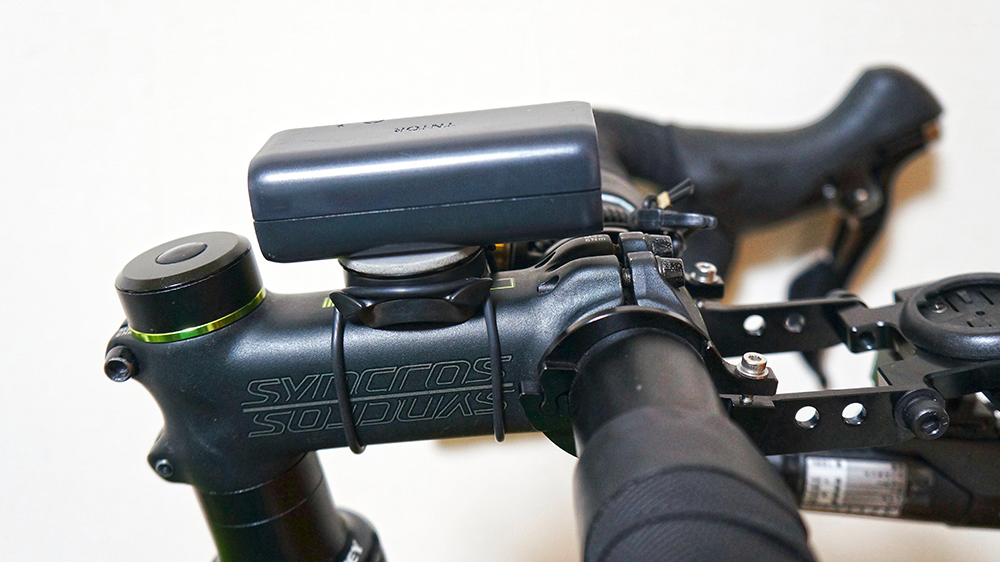 次にGarminの【ハンドル/ステムマウント】をステムに装着し、モバイルバッテリーを取り付けます。