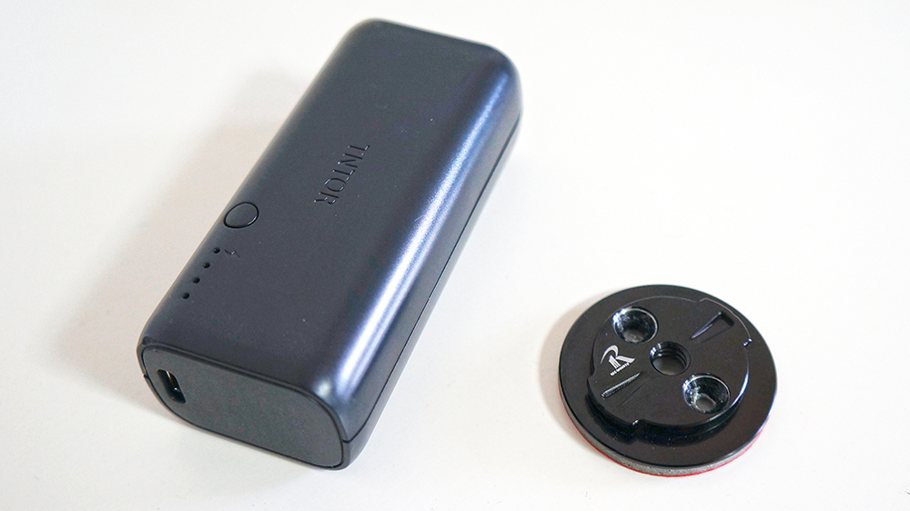 レックマウントの【汎用アダプター アルミタイプ】をモバイルバッテリーに接着。