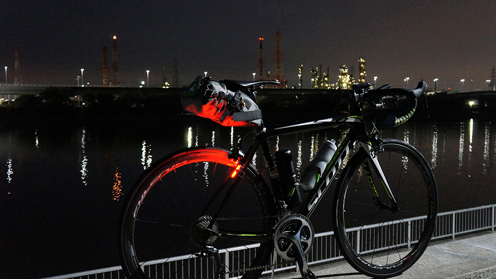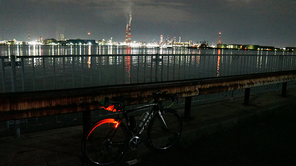 来た道を引き返し、工場群の夜景を見ながら走ります。