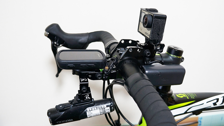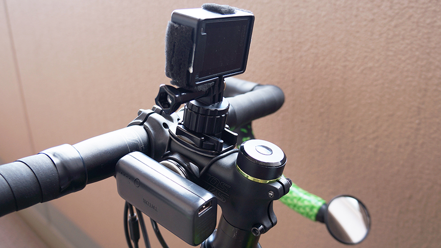 さらに数時間の撮影の為にモバイルバッテリーも取り付け。モバイルバッテリーはガーミンのマウントを使用、ステムの側面に付け、モバイルバッテリーに汎用アダプターアルミタイプ[GM-3MA]を接着。